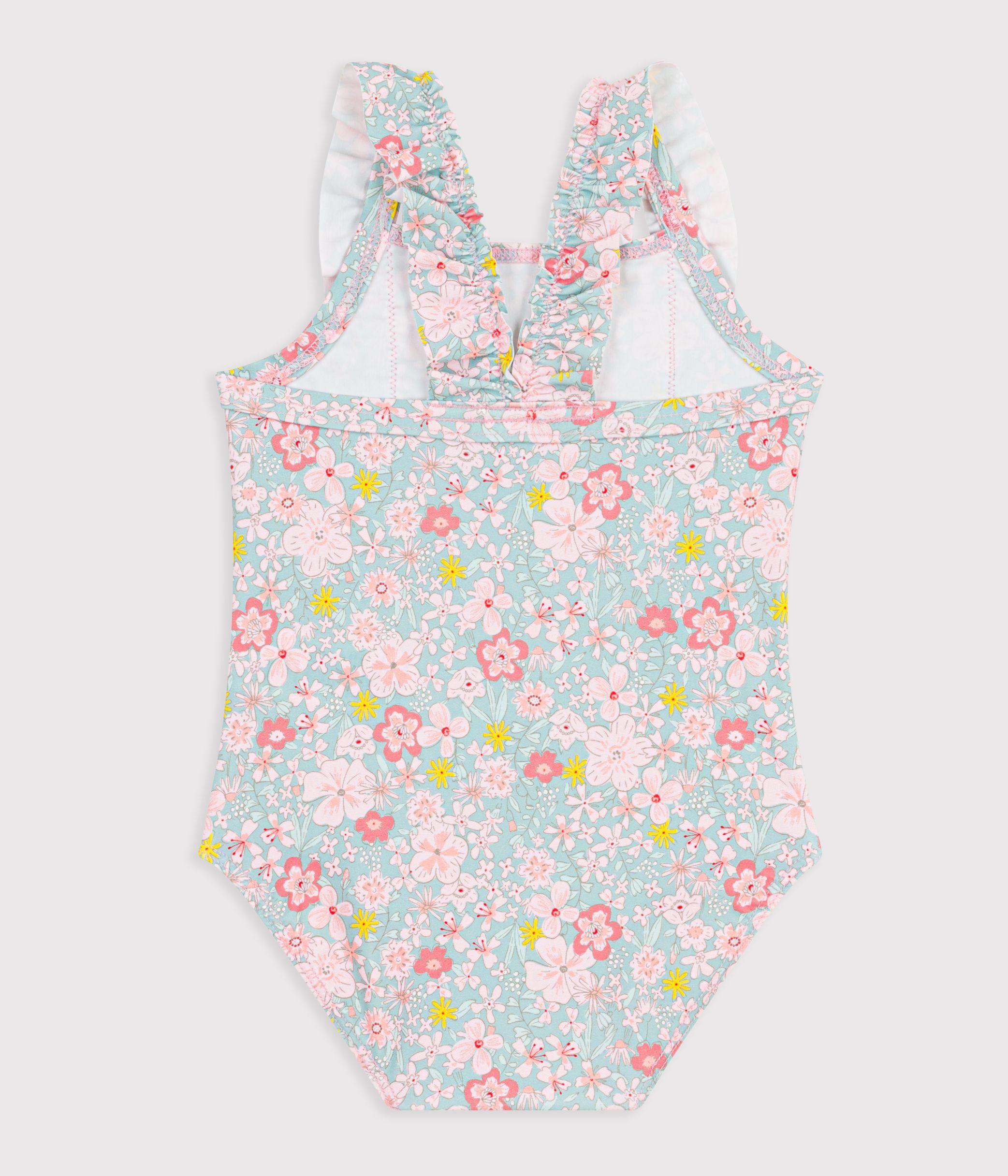 Babies' one-piece swimsuit with ruffles and a flower print.