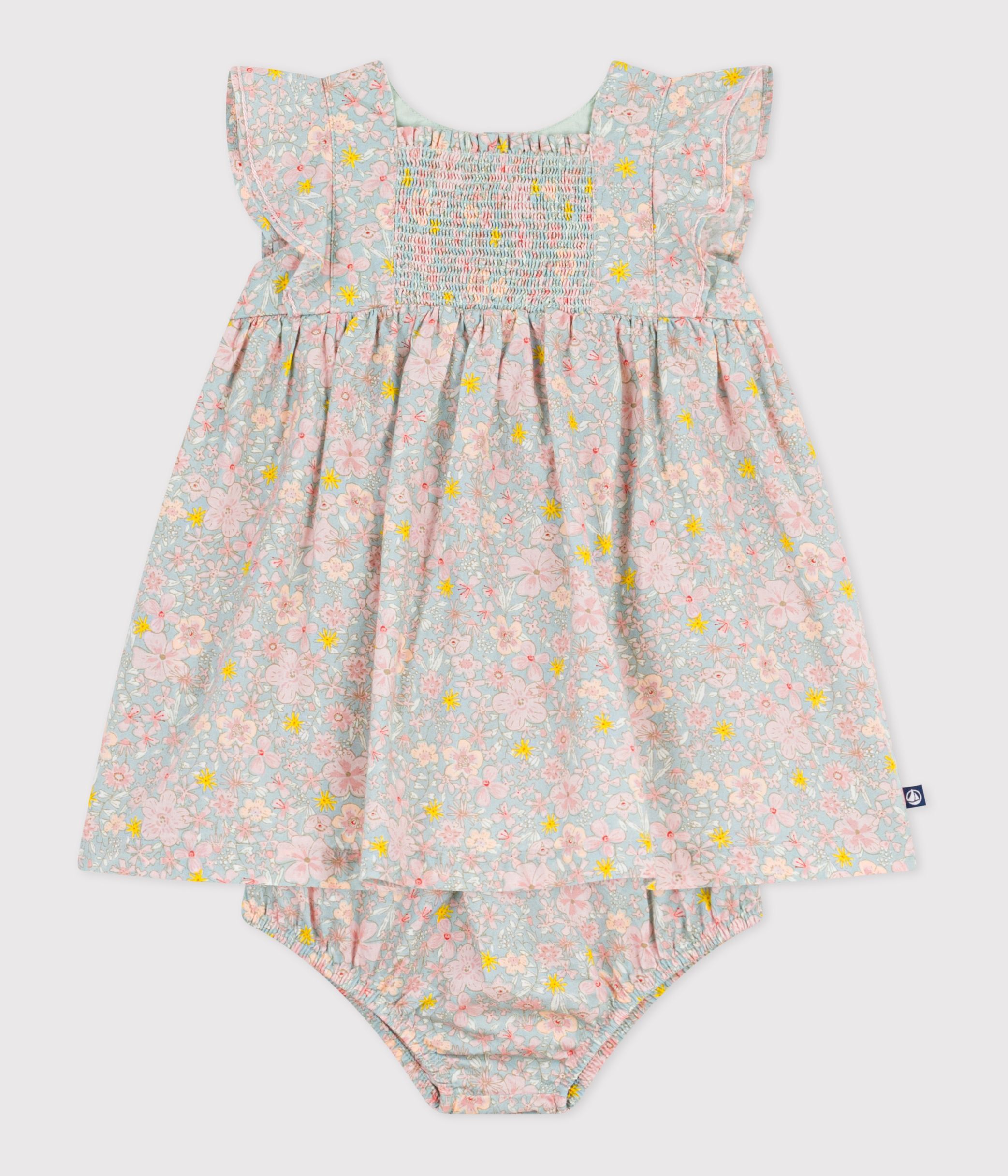 Babies' short-sleeved cotton dress and matching bloomers printed with hearts