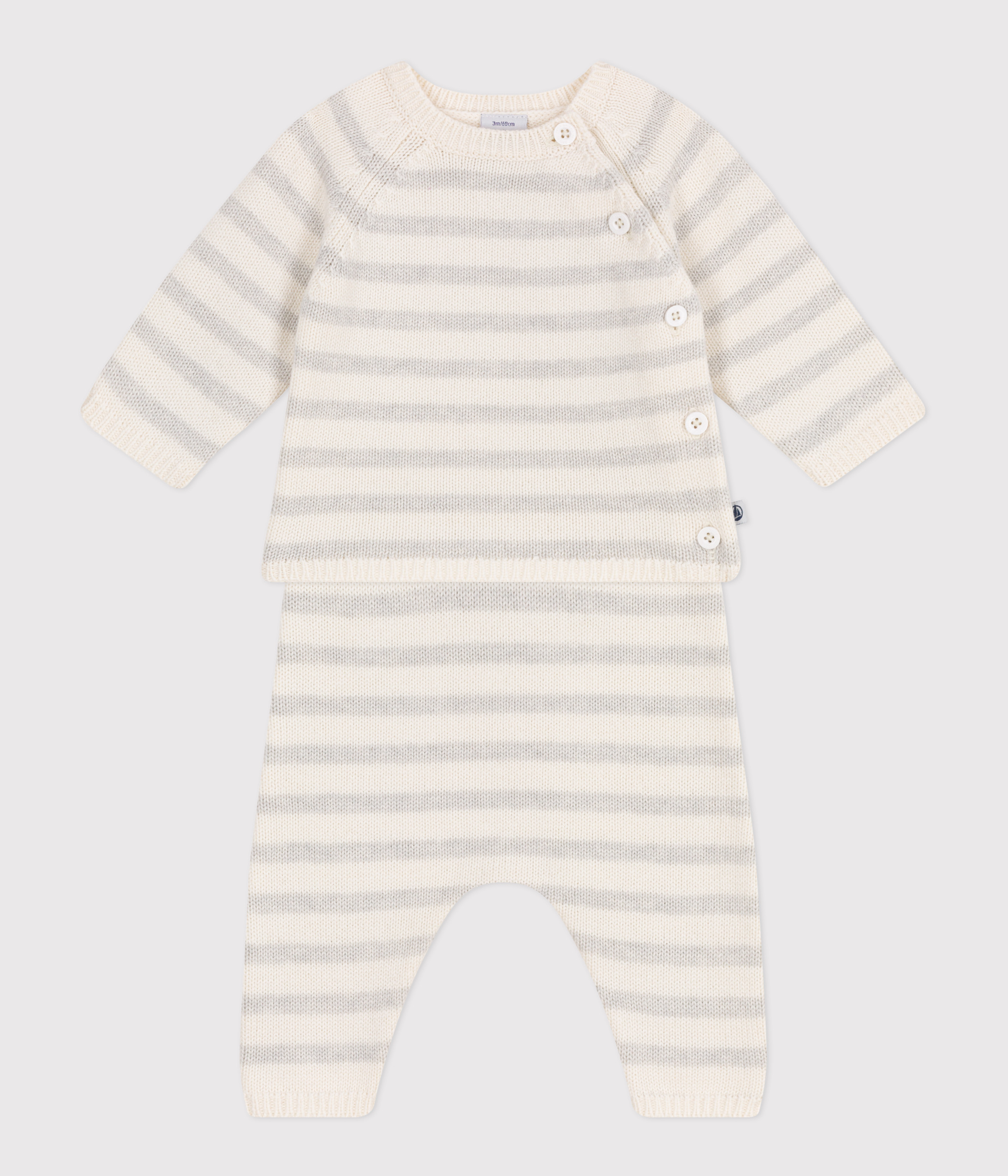 Unisex knitted cardigan and trousers made from a warm, comfortable knitted fabric containing wool.
