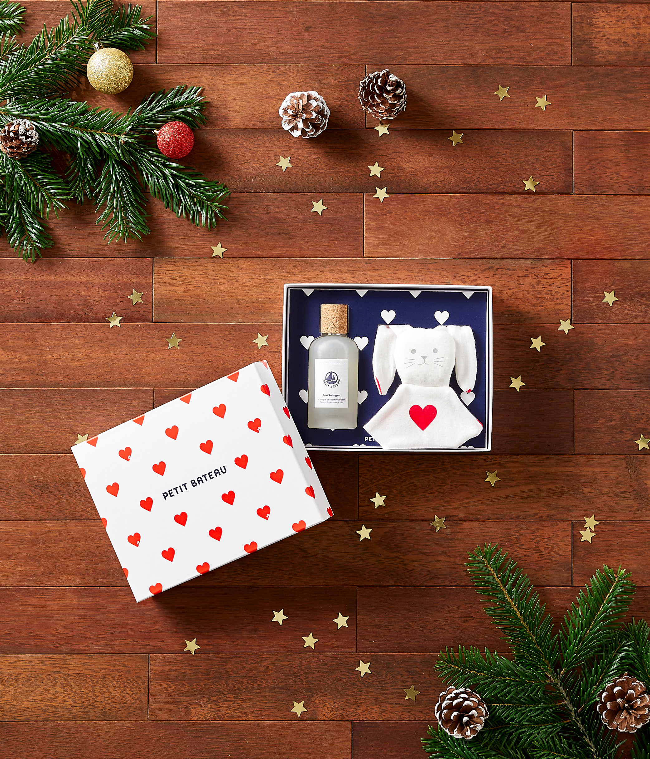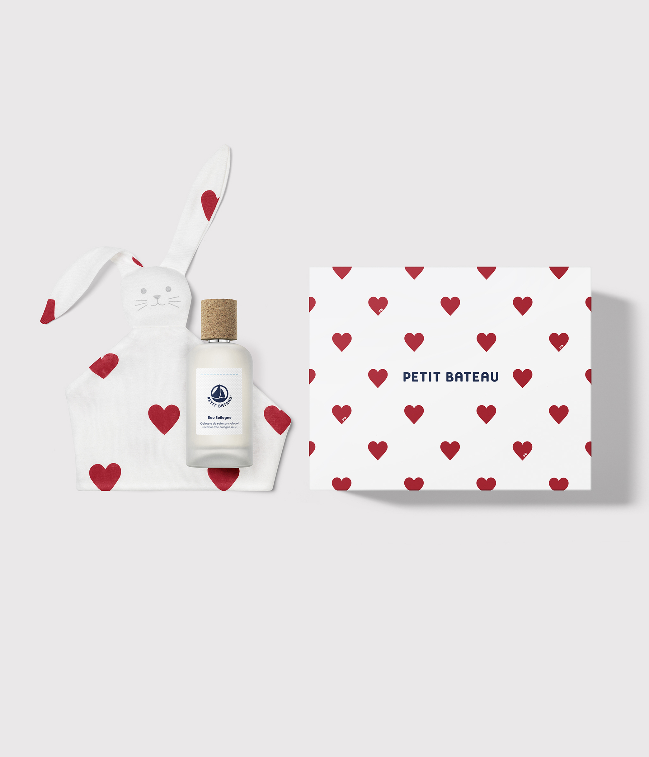 - A gift box composed of a 100ml alcohol-free relaxing scented water and a cotton heart comforter, to be given from birth.