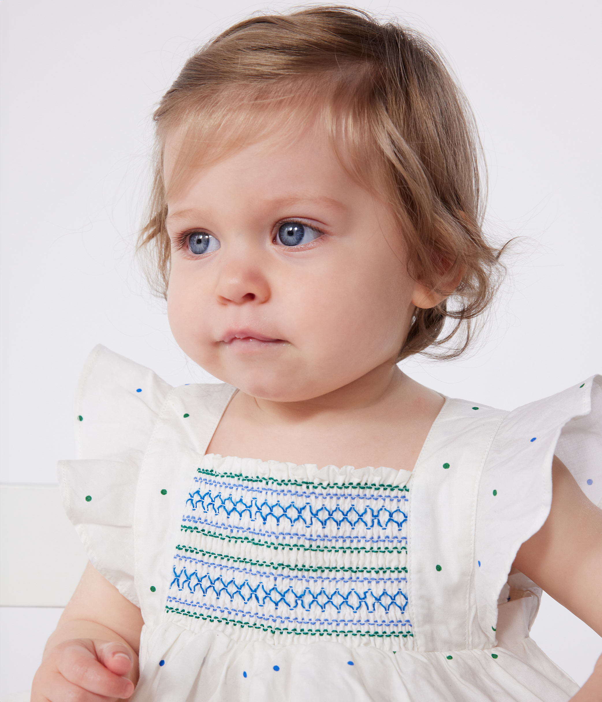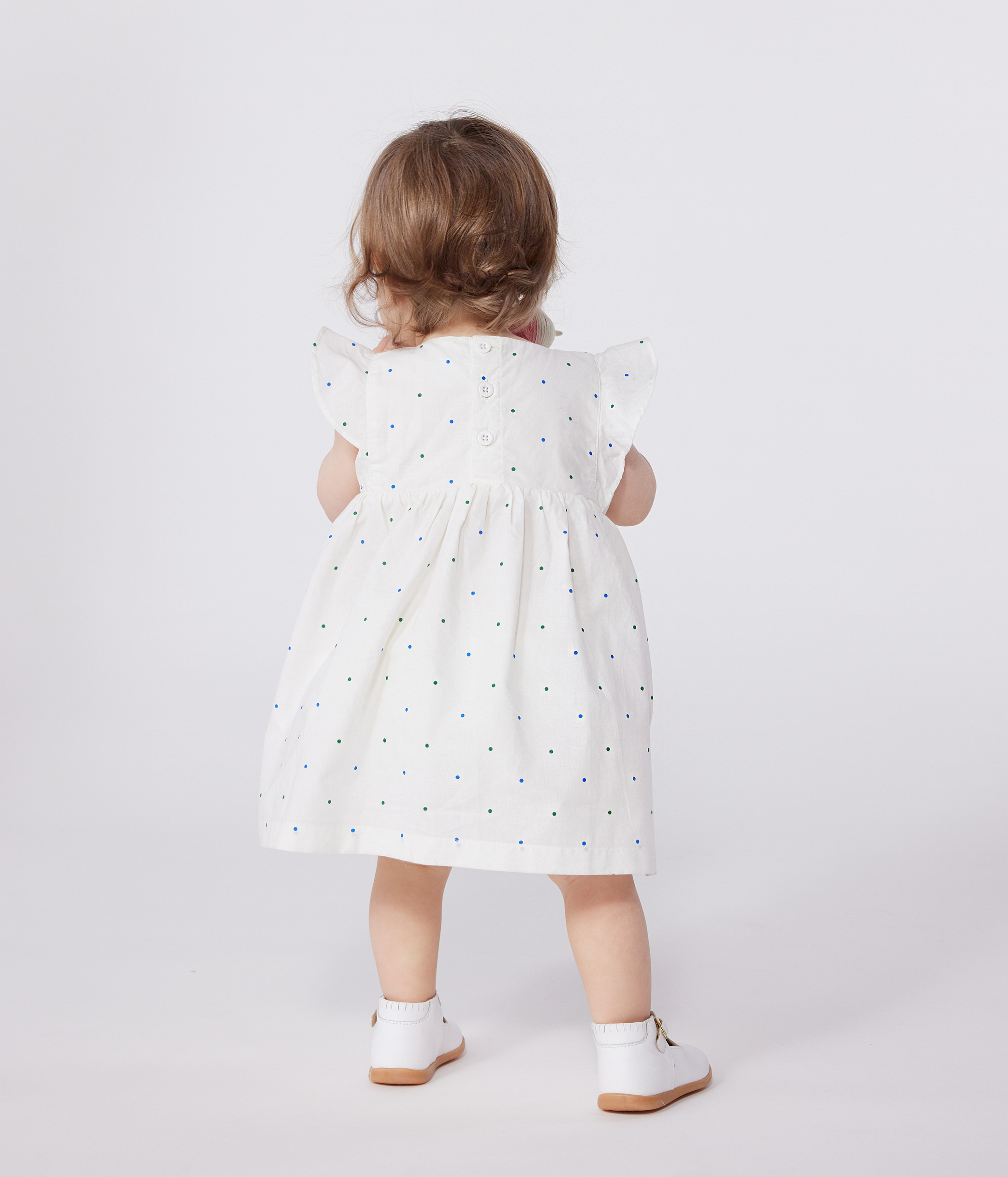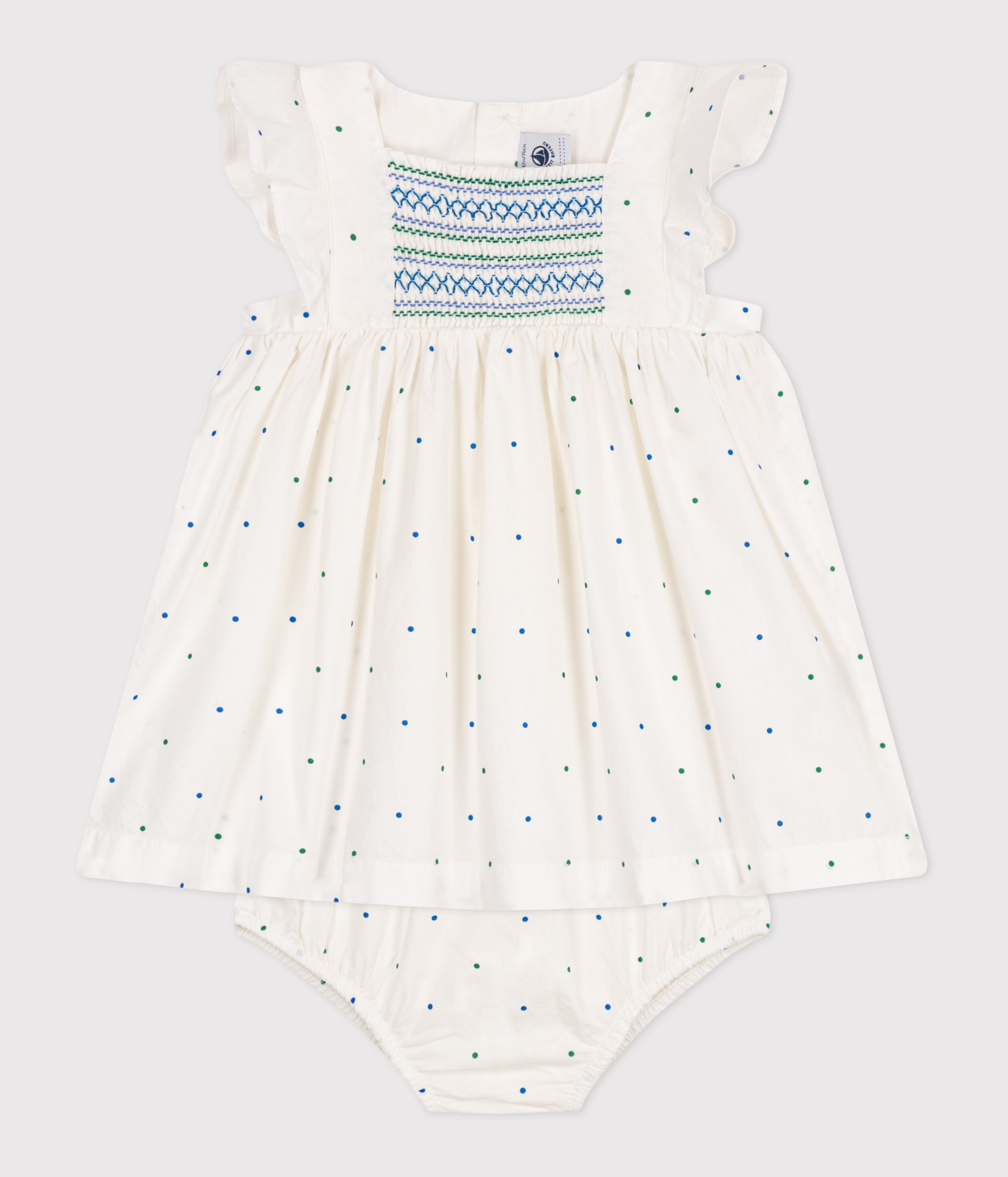 Babies' white cotton dress and bloomers printed with spots