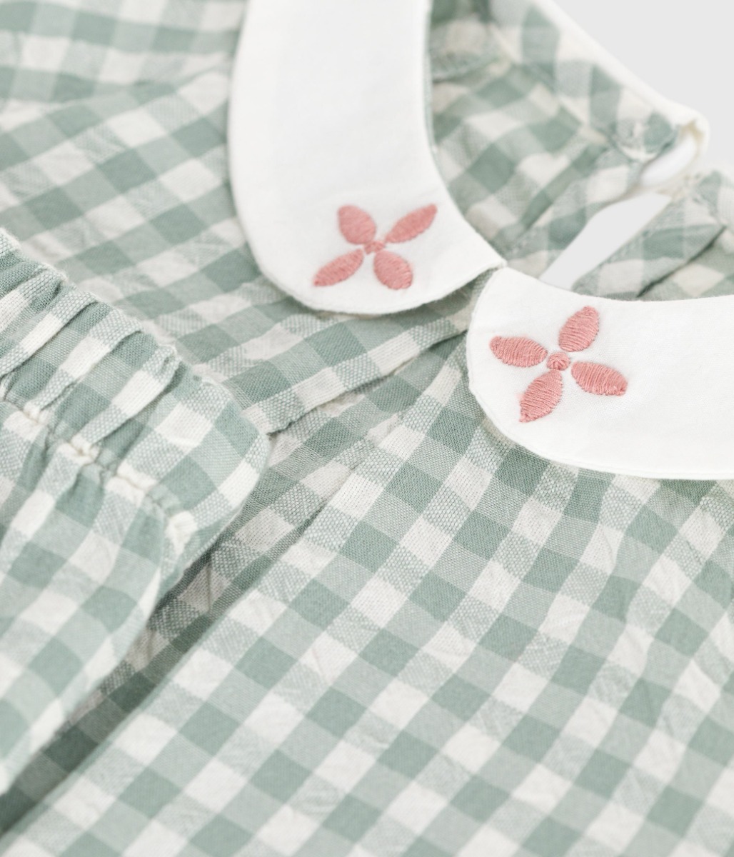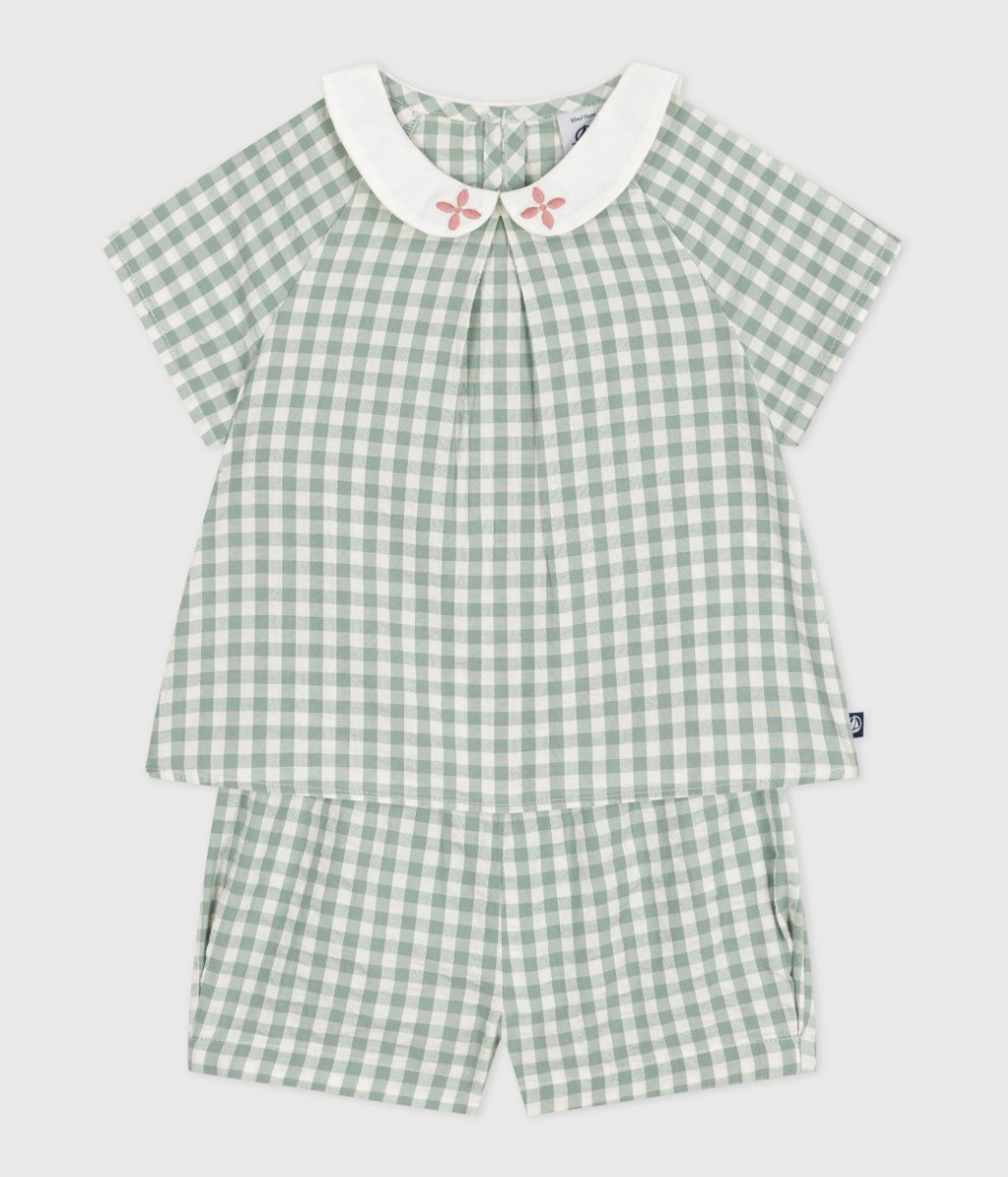 - We love the blouse in this gingham set, with its delicately embroidered Peter Pan collar!