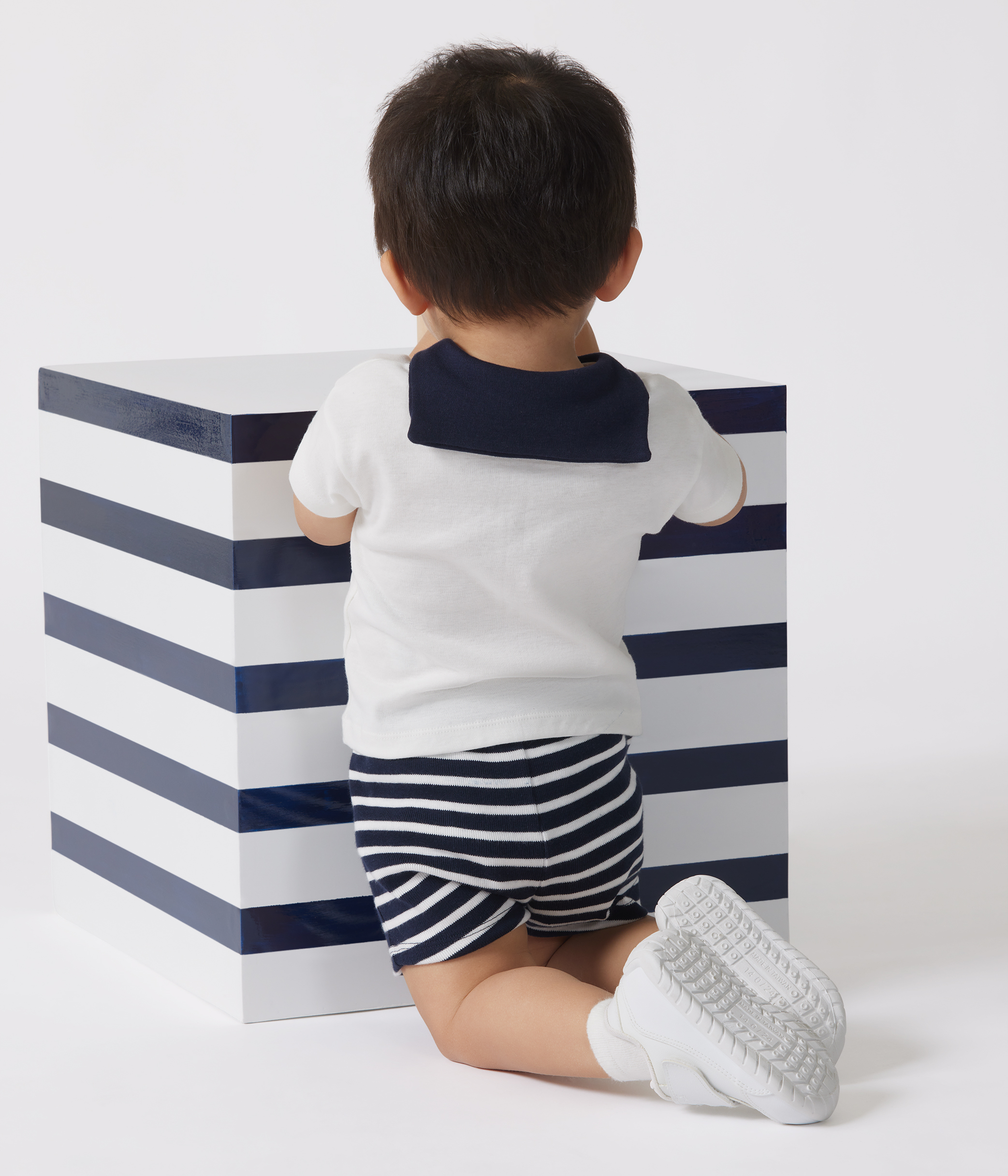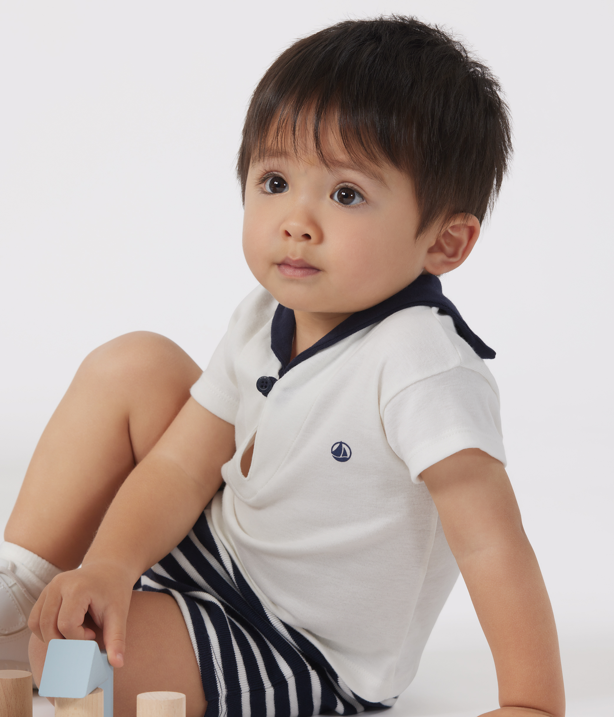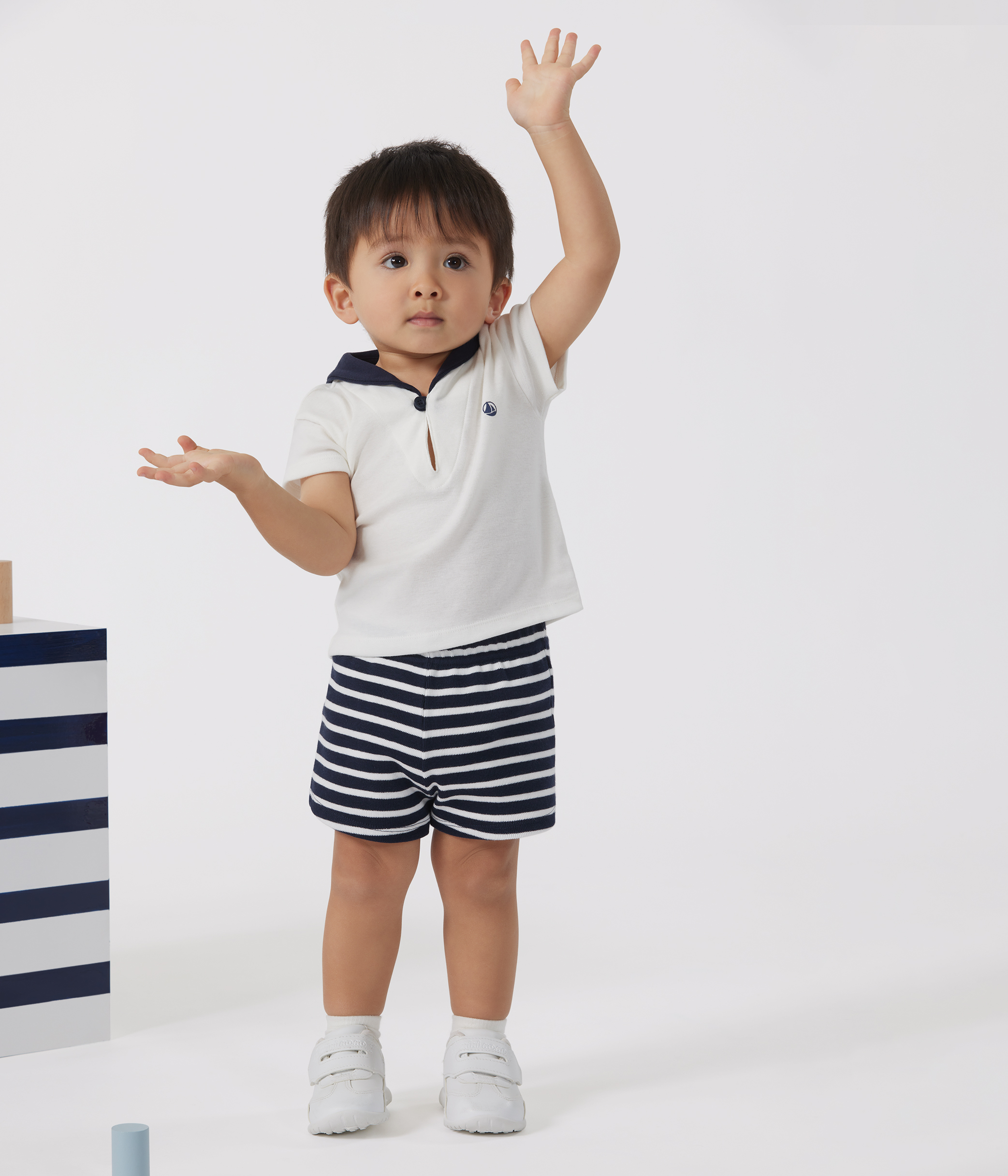 • Plain T-shirt with contrasting sailor collar and stripy shorts.