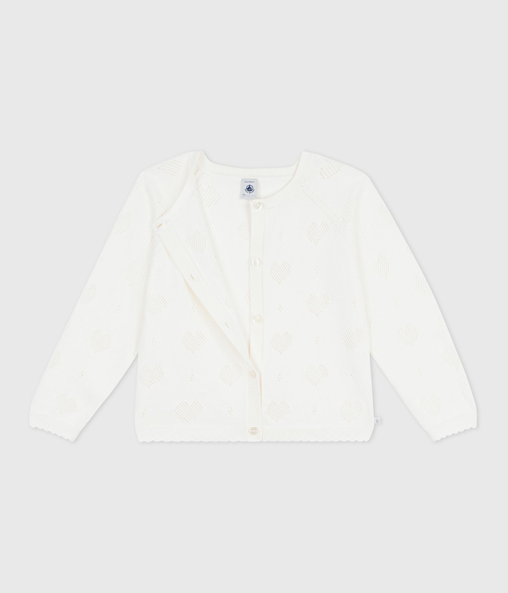 - Girl's 100% cotton knitted cardigan in an openwork stitch with a heart motif.