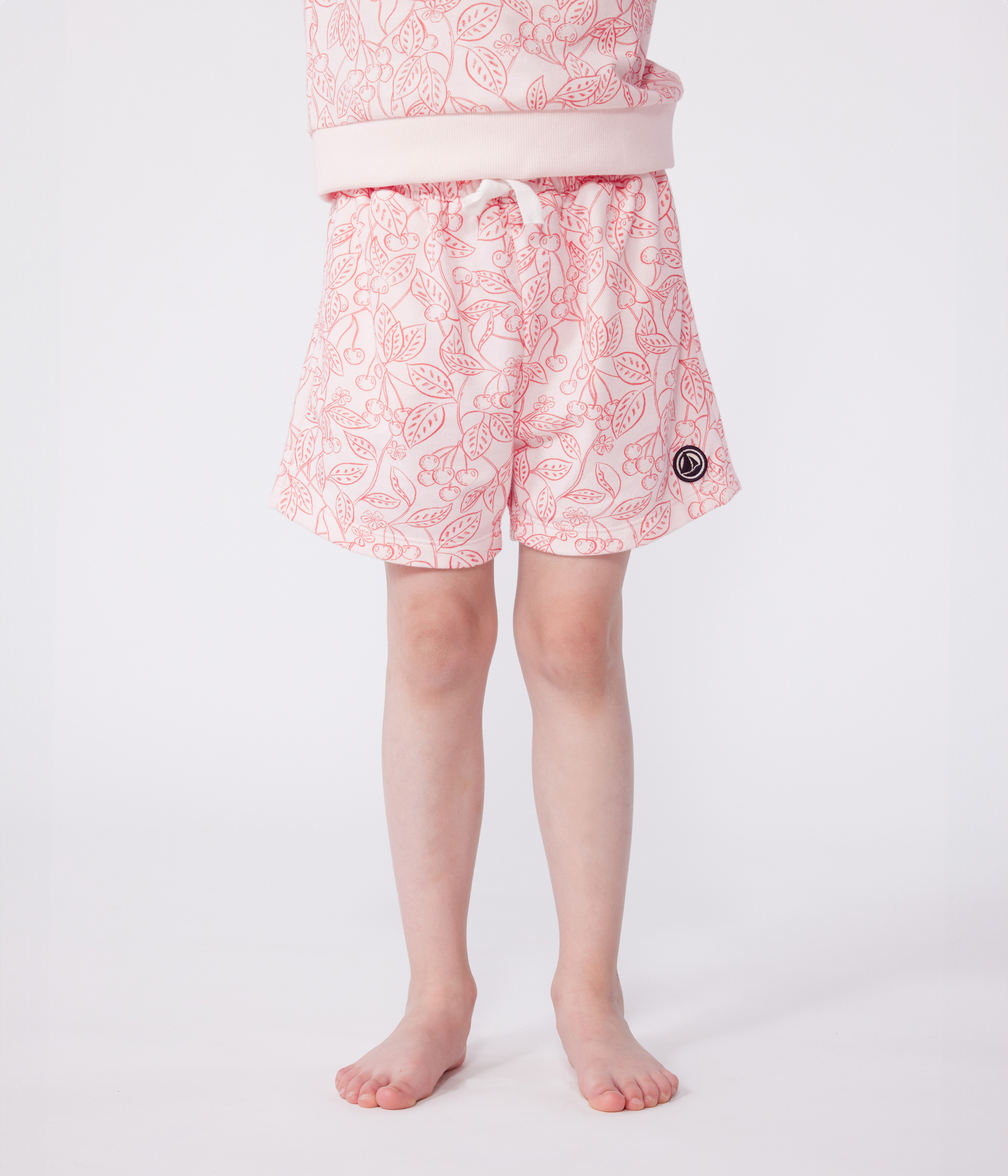 Girls' shorts in lightweight cherry-print fleece, a fabric that combines lightness with the comfort of fleece.