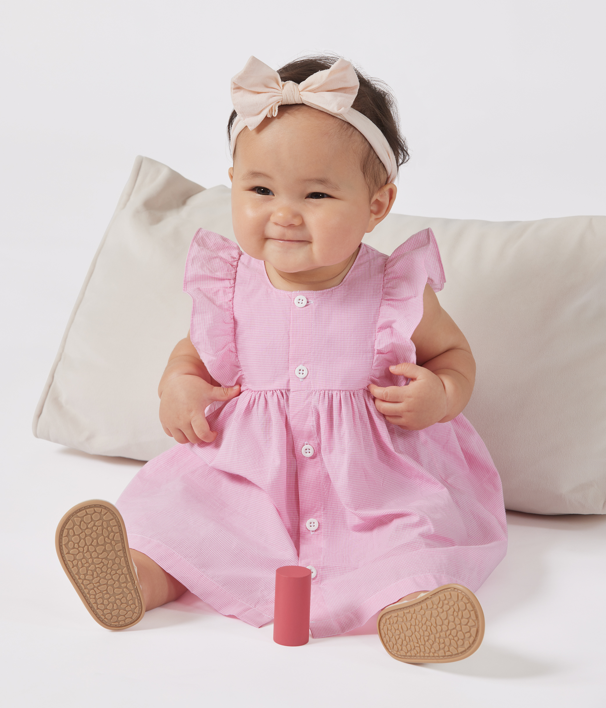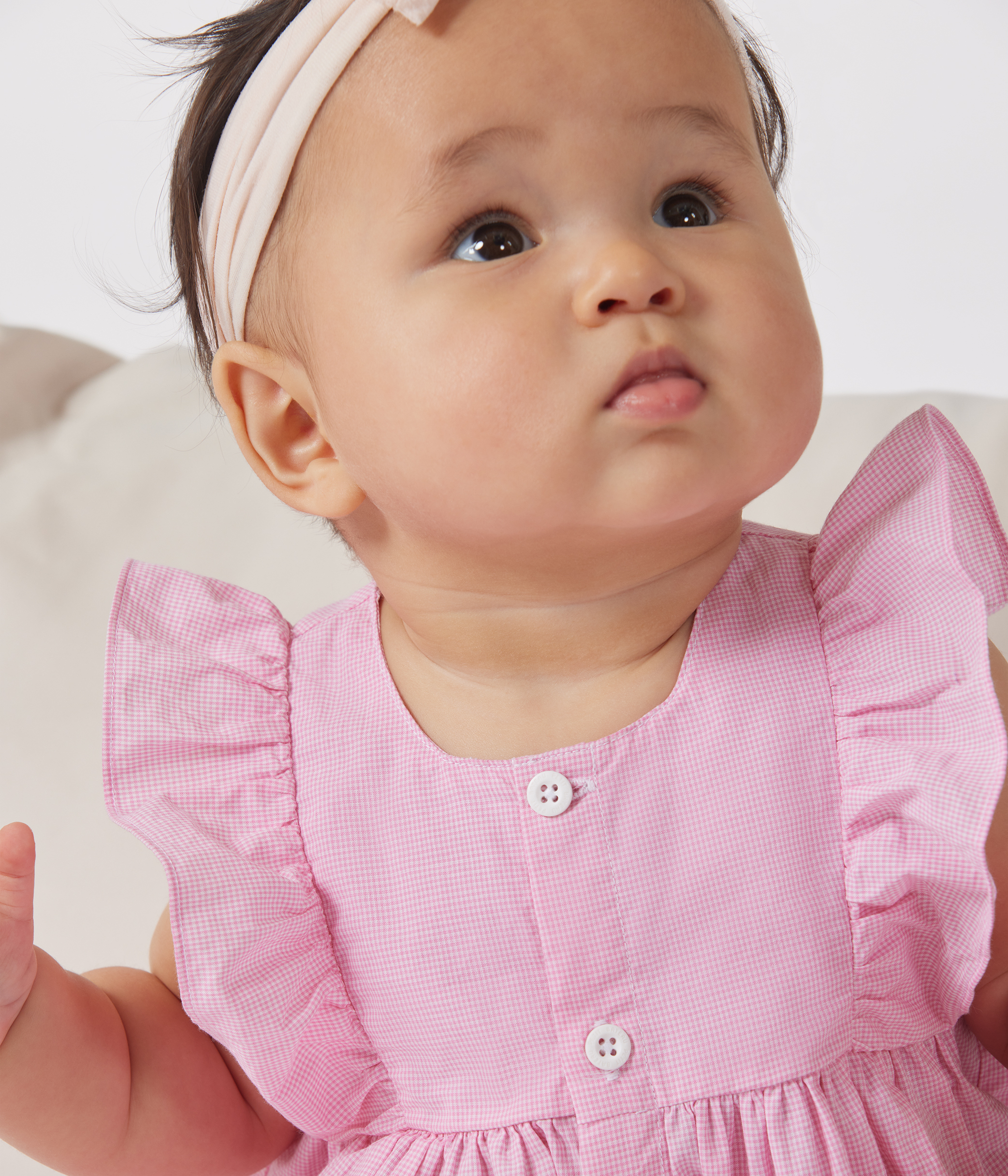 - Just adorable with its ruffled shoulders, gingham print and full-length button fastening!