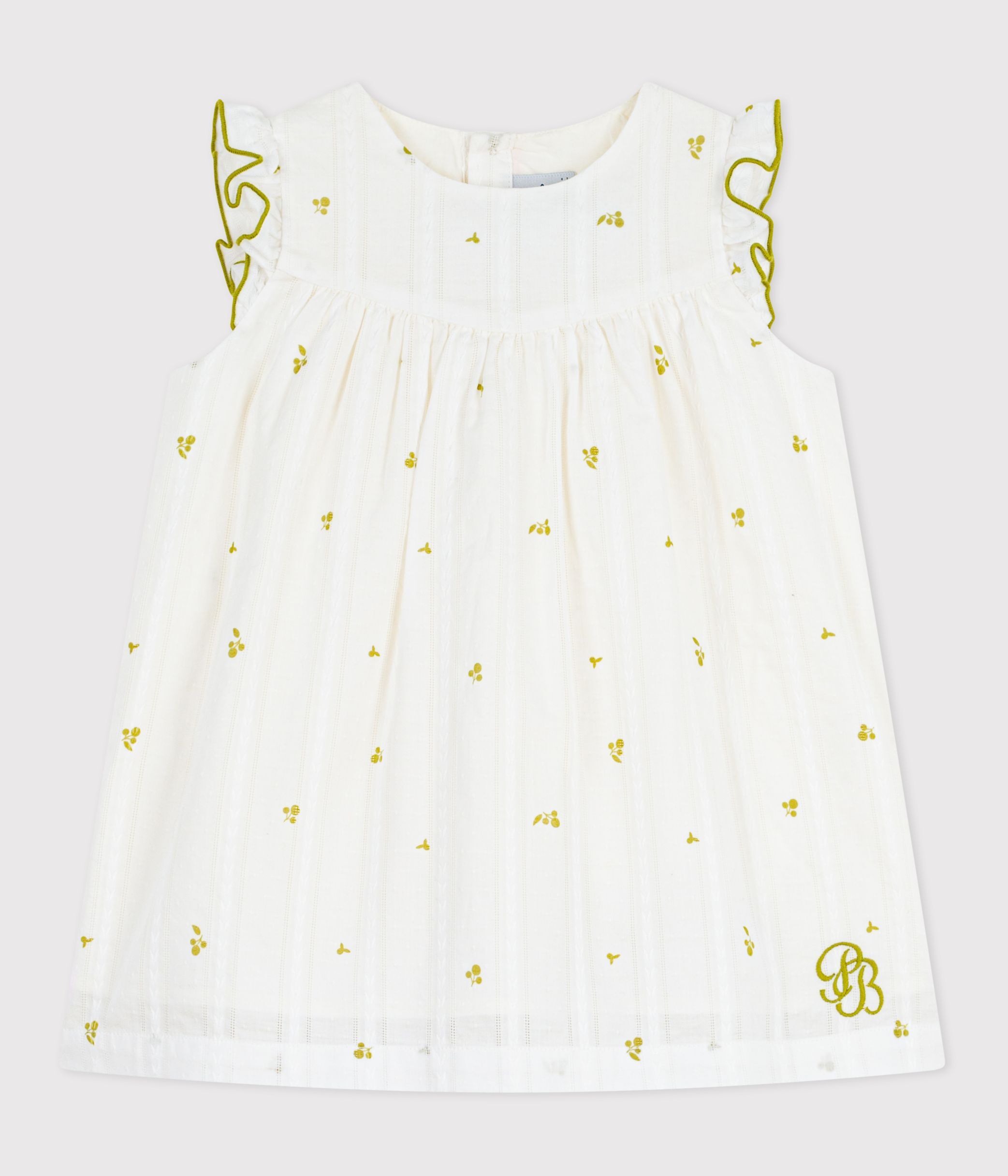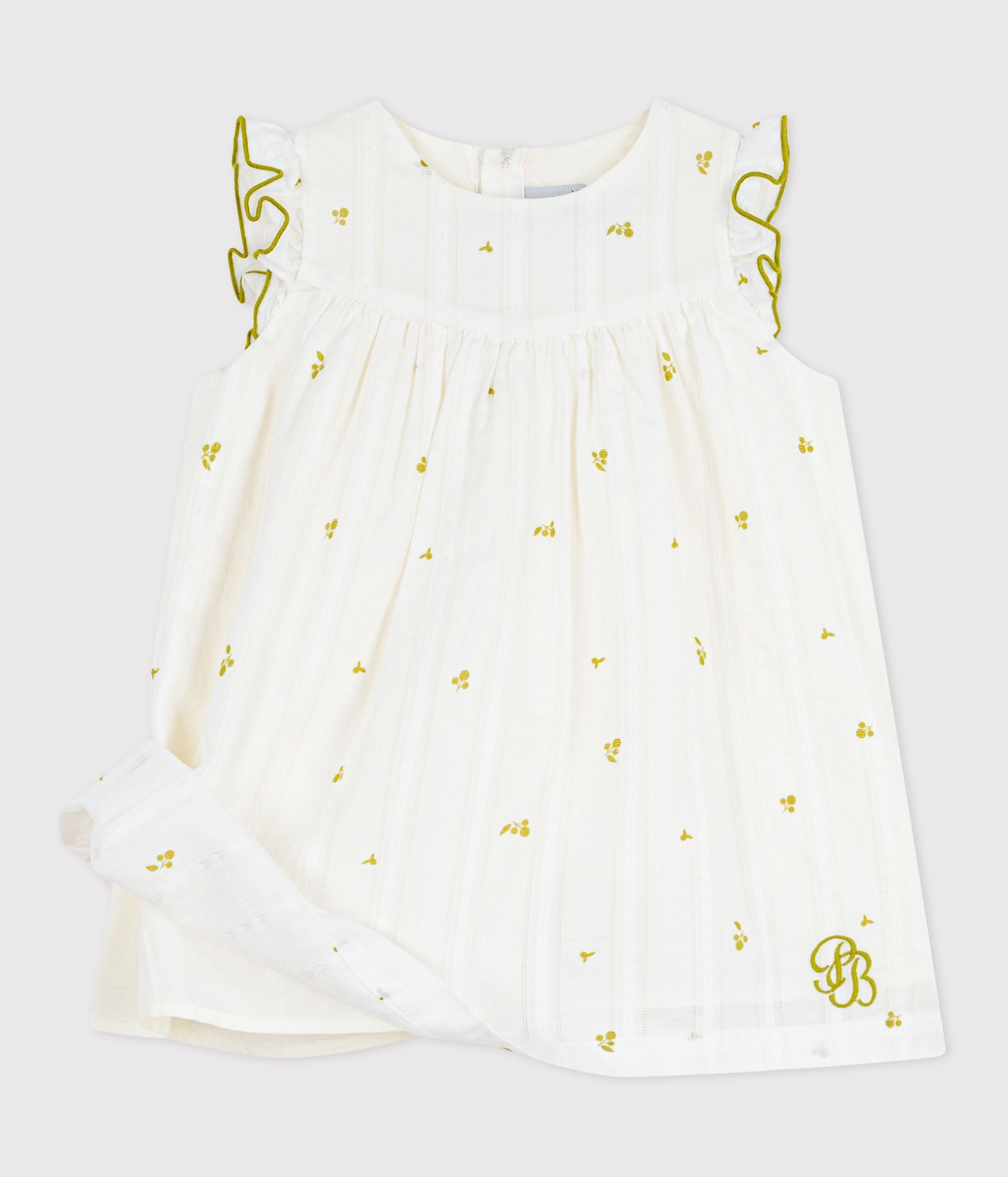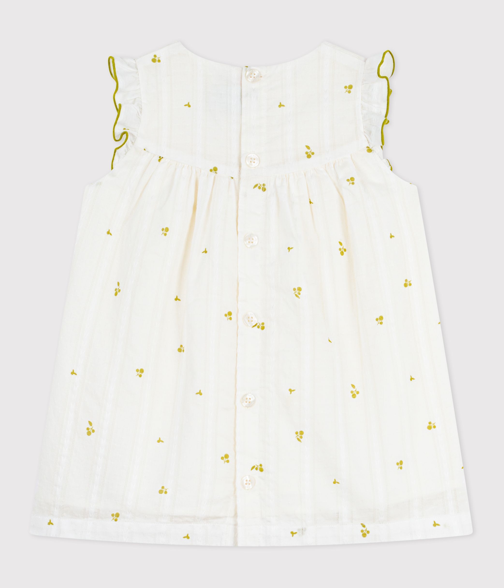 Girls' dress in textured poplin, a light, fine, woven fabric with a slightly textured look.