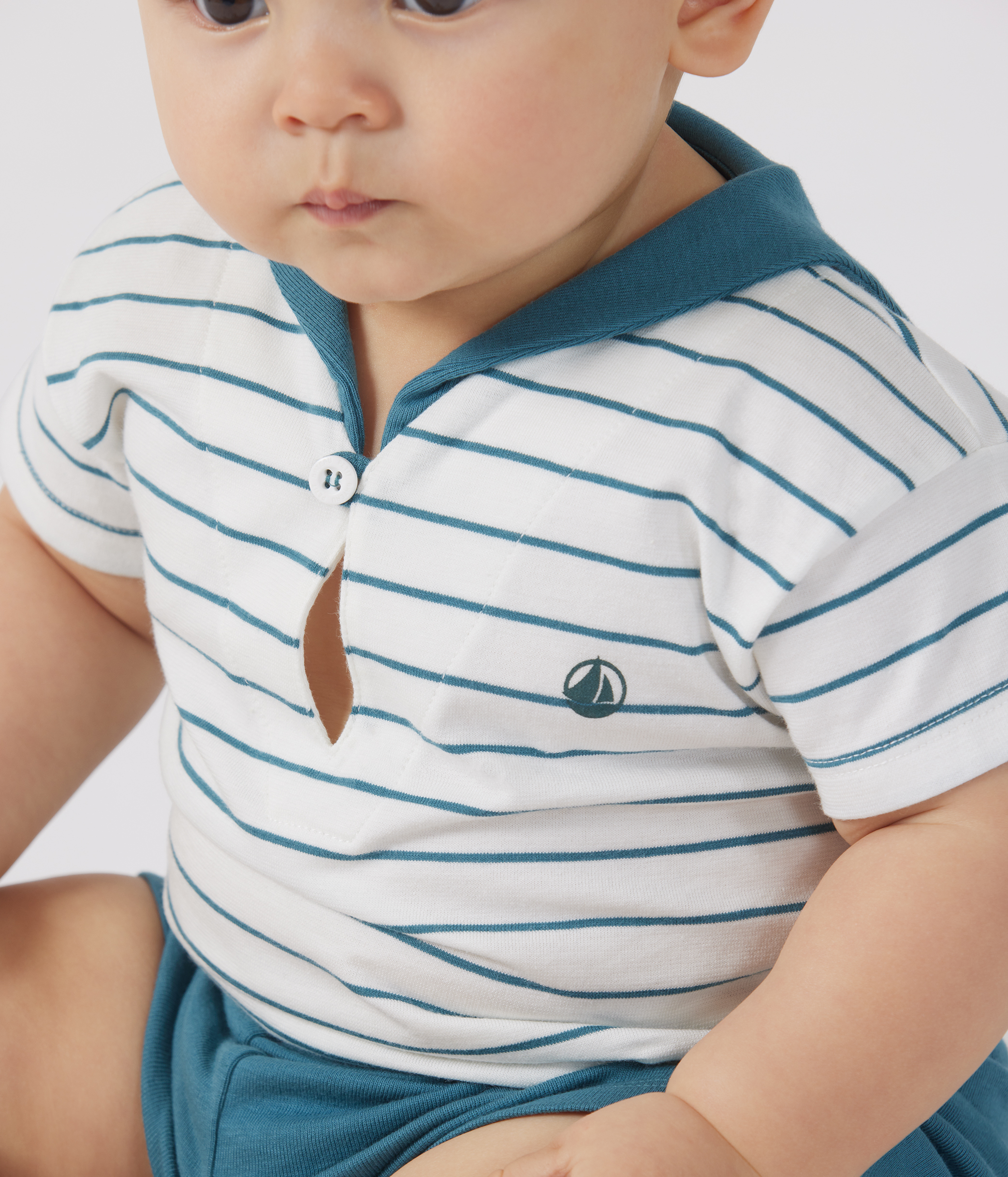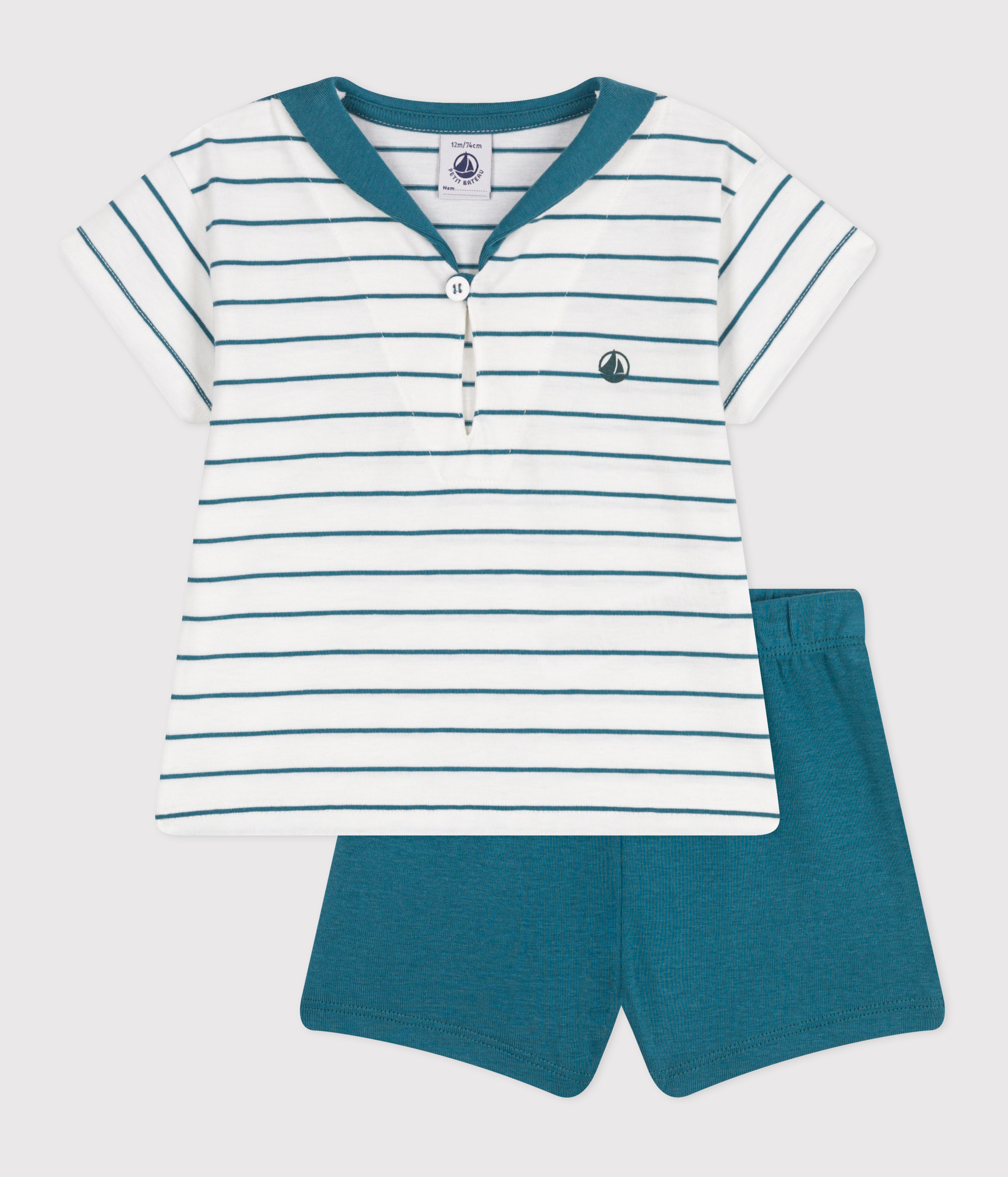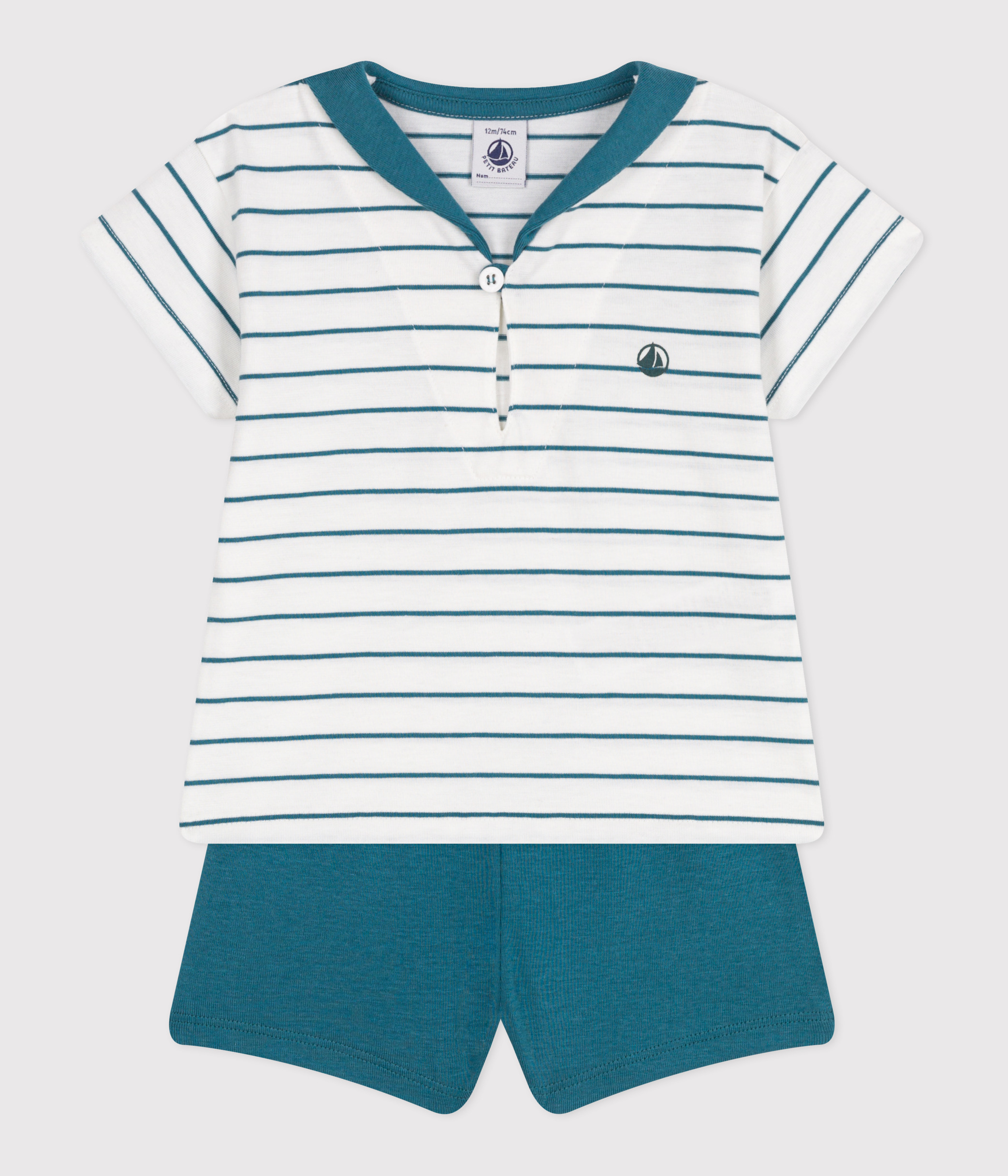 - Striped t-shirt with a sailor collar and plain shorts.