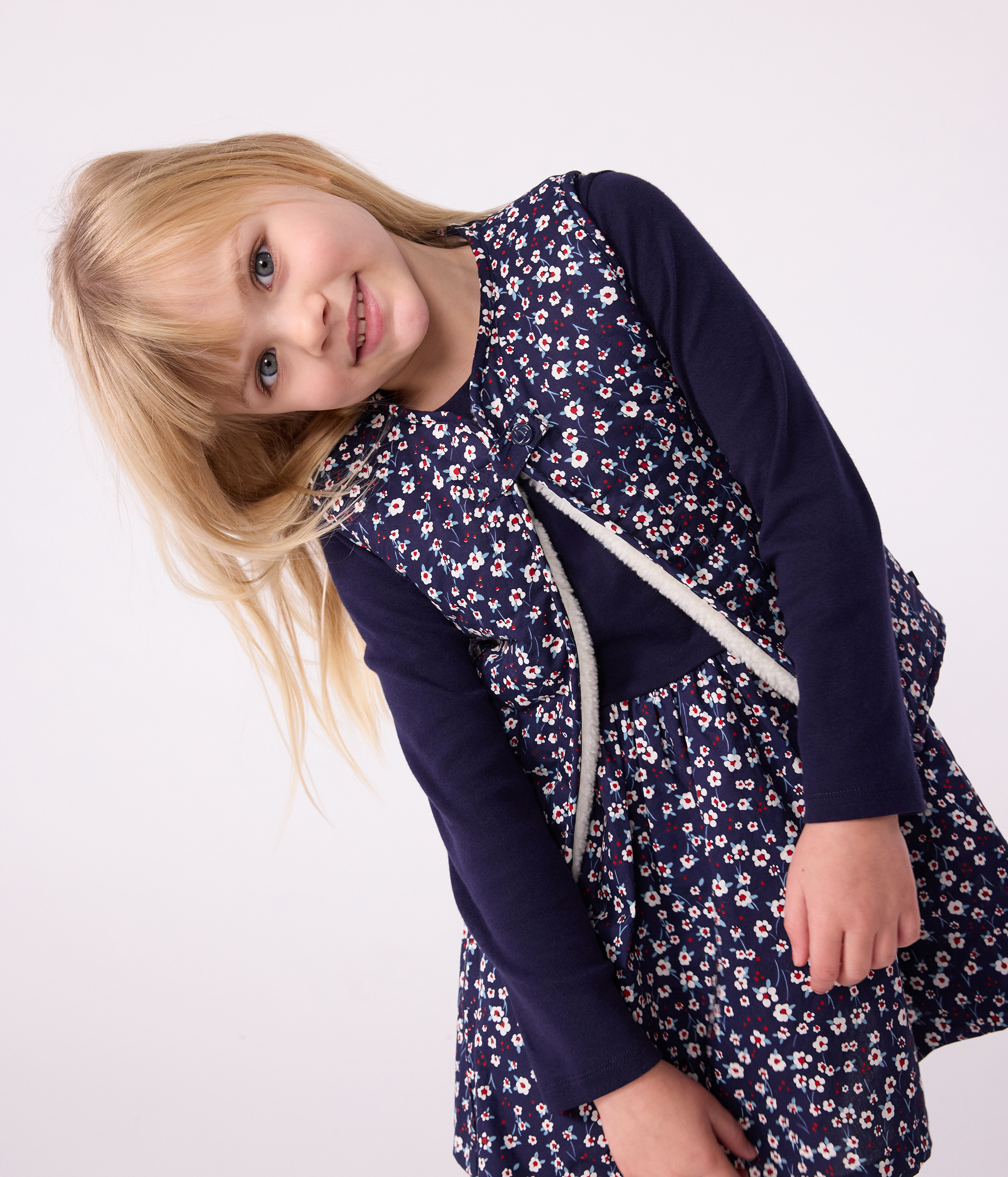 Girls' reversible sleeveless cardigan with one side in poplin and the other in quilted sherpa.
